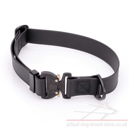 The collar is equipped with a reliable and handy in use "cobra" buckle. It is made of steel and is break-resistant. There is a weld D-ring on the collar to attach a leash. The size of this biothane dog collar with cobra buckle is easily regulated. You can use the collar as for everyday outings so as for training and service work. This biothane collar with cobra buckle is the best option for active Staffy and Pitbull!