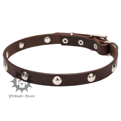 Among the great variety of designer dog collars UK this product stands out for its simplicity and elegance. Only genuine thick leather and shiny silver-looking half-ball studs are noticeable. But your beloved Staffy, Pitbull or Bull Terrier feels greatest comfort when in this narrow dog collar. Our soft leather dog collar won't rub your pet's hair and neck. It is absolutely safe and harmless. Full grain leather is well-oiled, ends of this narrow dog collar is rounded and all chrome plated fittings and adornments are polished to prevent hurting of your doggy.