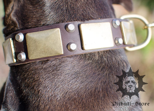 Wide Leather Dog Collar with Brass & Nickel Decorations